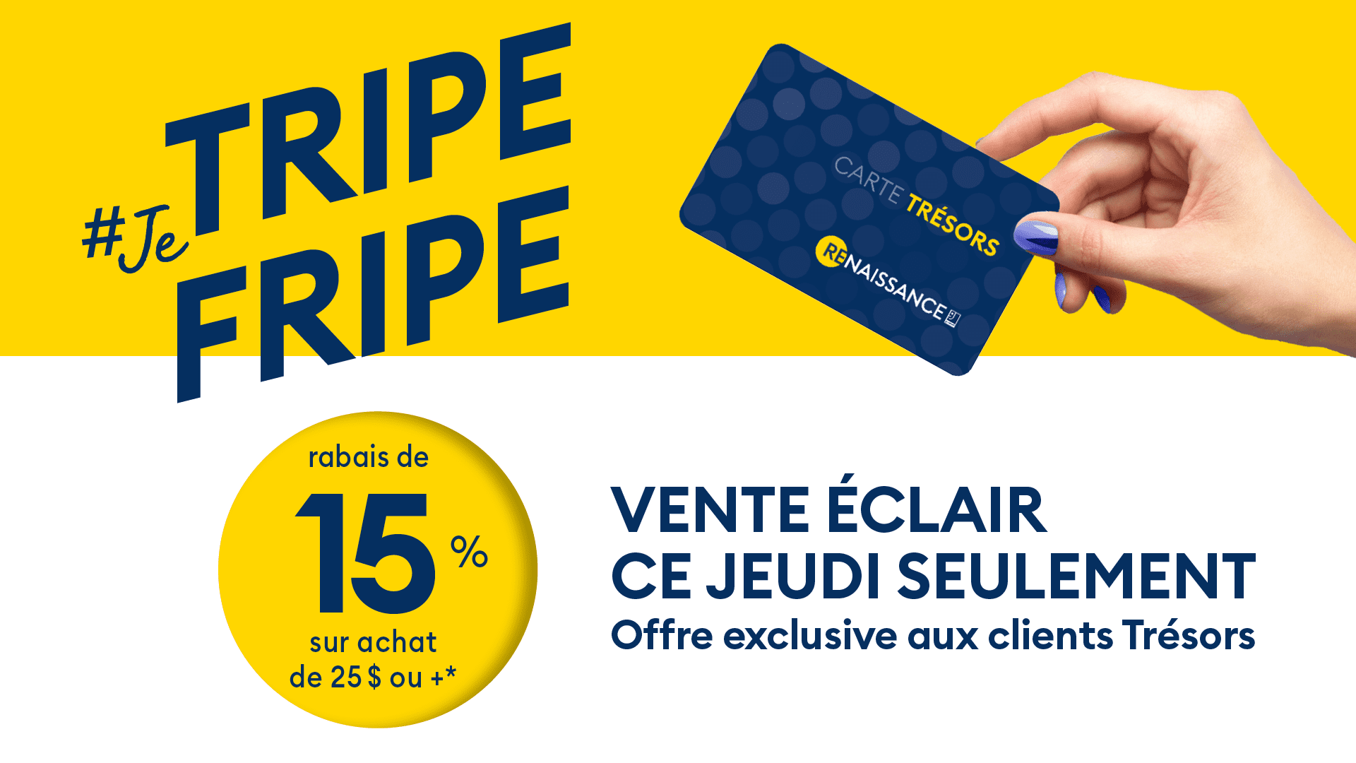 VENTE FINALE. Offre exclusive aux membres du programme Trésors sur tout achat de 25 $ ou plus. Cette offre ne peut être combinée à aucune autre. Offre non valide dans les magasins Kilo, à la friperie Renaissance de Terrebonne (421, rue Léveillé) et à la librairie Faubourg-des-Prairies. Présentez ou obtenez votre carte au comptoir-caisse.